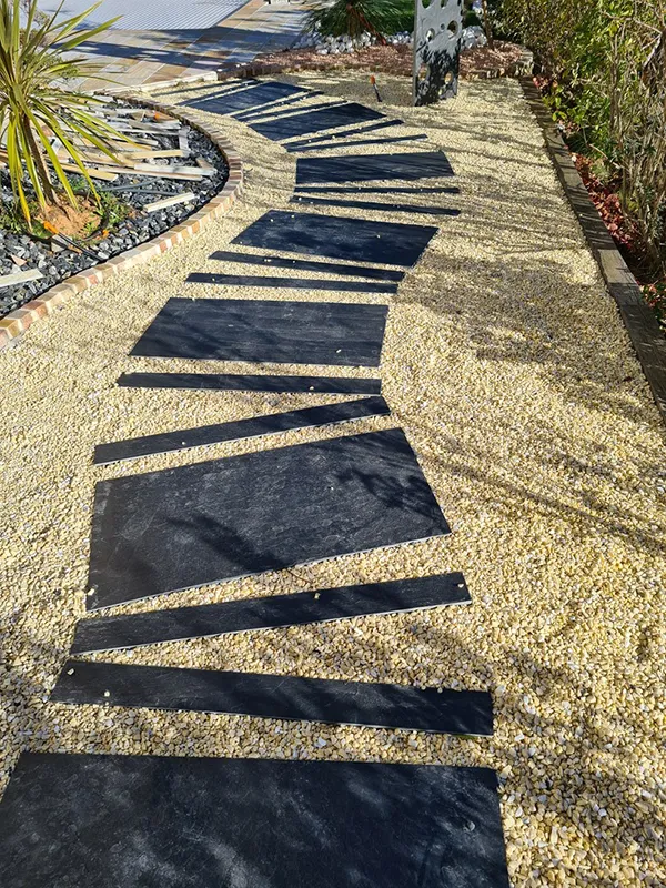 Plaques ardoise Ebano 100x30cm brique pilée et pelouse synthétique