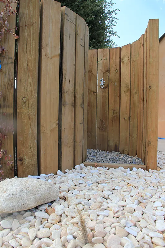 Galets jaune sunlight et traverses pin